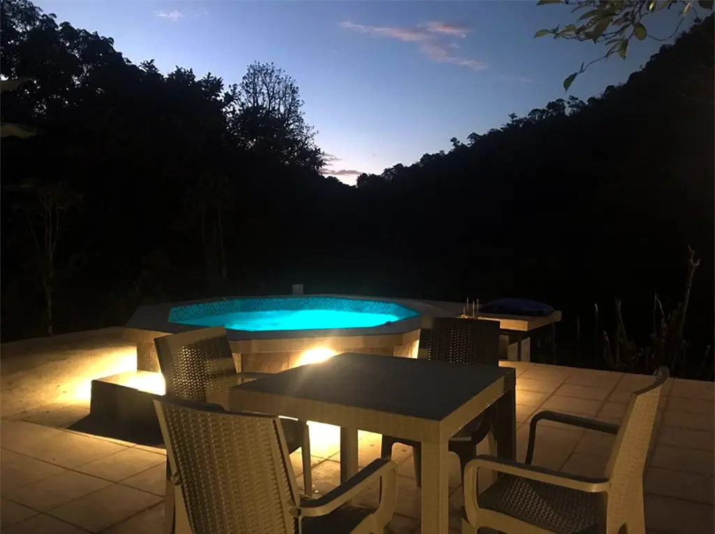 Al caer la noche, el Manantial del Colibrí se transforma en un escenario mágico. Bajo la luz de la luna, sumérgete en las cálidas aguas de nuestro hidromasaje al aire libre, donde las estrellas parecen descender para acariciar vuestra piel. Dejen que el agua y el silencio los envuelvan en una atmósfera de ensueño, donde cada mirada se convierte en un universo de pasión y cada beso, en una promesa eterna.
